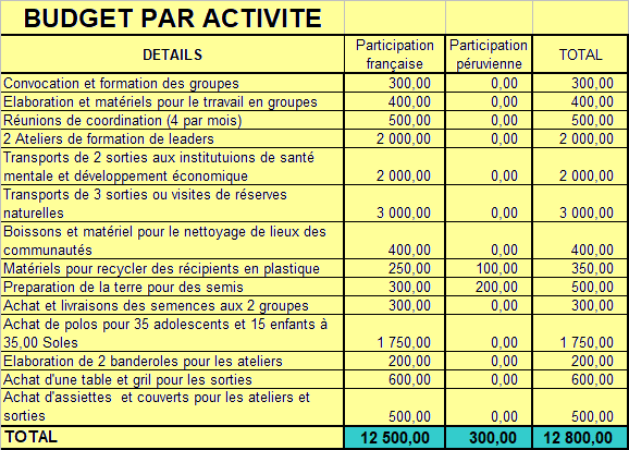 Résultat 3 (Développer l'agriculture biologique par le biais d'un jardin communautaire) 1.1 Réunion de coordination avec les adolescents pour sélectionner les produits les plus consommés dans leur communauté. 1.2 Préparation du terrain et du sol pour les semis. 1.3 Achat et distribution des semences à chaque groupe. 1.4 Planter les jeunes plants. 1.5 Vendre les jeunes plants à prix réduit. 5 BUDGET PAR ACTIVITE 6. SUIVI ET ÉVALUATION Cette activité sera réalisée par la coordinatrice Cristina Ramírez-Saelens, qui sera chargée de rédigerle rapport des activités menées dans le cadre de ce projet. |